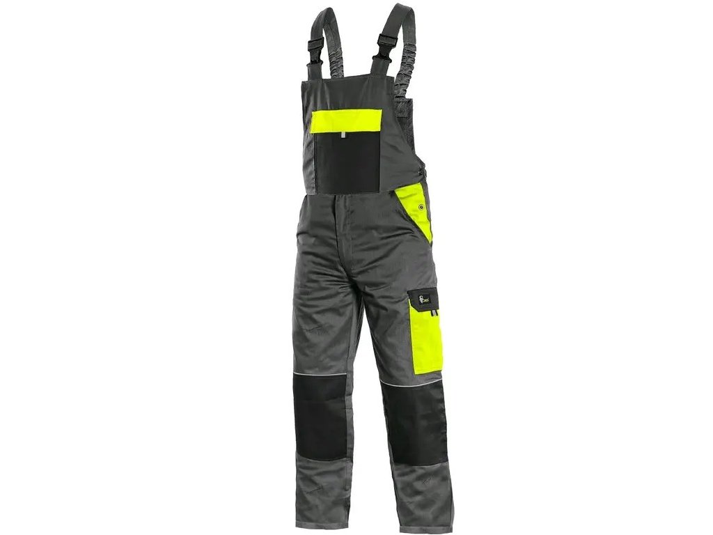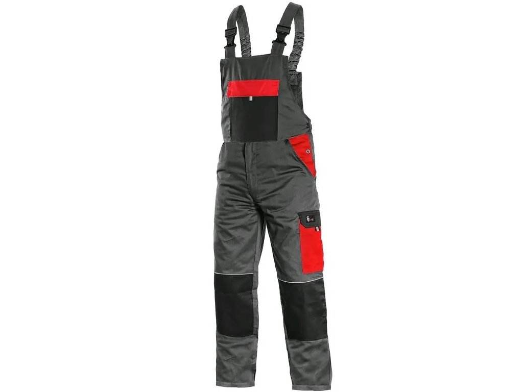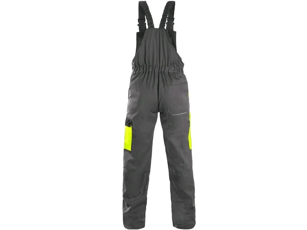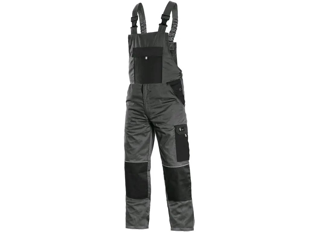 -Náprsné vrecko s chlopňou, predné klinové vrecká, bočné vrecko s chlopňou, vrecko na meter-Zdvojené kolená, zadné jednoduché vrecko, traky vzadu na gumu, reflexné doplnky.