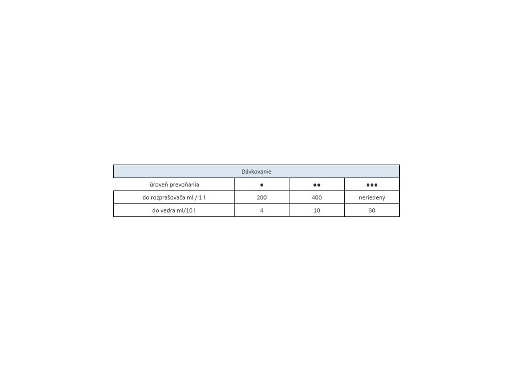 -Účinne neutralizuje pachy a zanecháva sviežu vôňu.-Pri rozprašovaní do ovzdušia (napríklad v kancelárii v prítomnosti osôb) je možné parfumačný účinok zjemniť zriedením pitnou vodou a tým súčasne zvlhčiť vzduch.