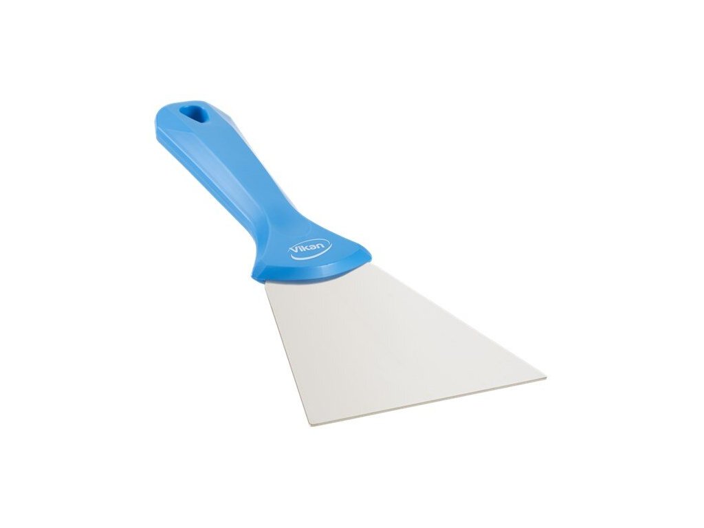 Škrabka je opatrená nerezovou čepeľou s ochrannými zaoblenými rohmi a špeciálnou ergonomickou opierkou prstov.