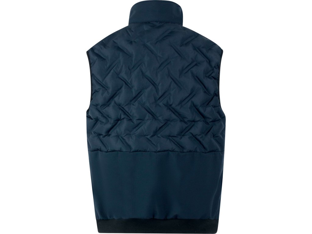 Hybridná vesta: prešívaný vrchný diel pre väčšie teplo a softshell spodná časť pre voľnosť pohybu.